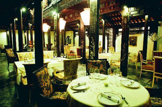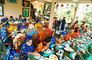 Ancient Hue states to be a boutique, leisure destination. Eight towering pillars, symbolizing the eight weapons meant to protect and guard the location, mark the entrance. Oversized plates and serving dishes are used in the restaurant; garnishes on dishes are teetering works of art. If you are a less-is-more kind of person, you will be in small company. Staff members offer mini tours of a traditional Hue house furnished with antique furniture and a clay house that will be home to an art gallery featuring local artists. The menu is based on the feasts of the Nguyen emperors' banquets. A chef, formerly of the Hilton Hanoi Opera, heads up the kitchen and offers creative dishes like chicken and banana blossom salad and grilled minced shrimps on sugar cane.